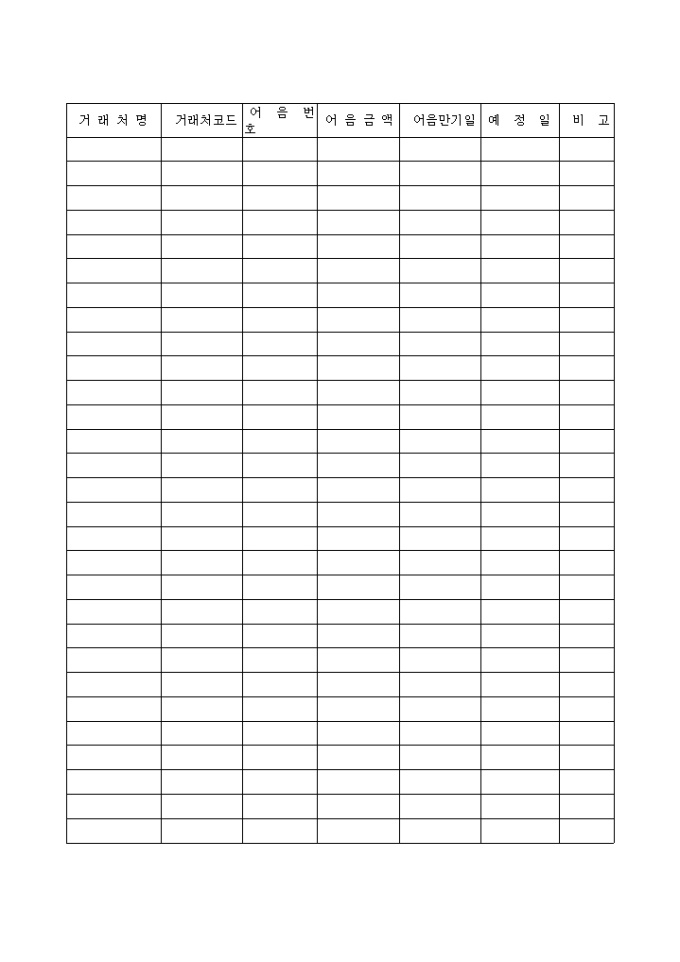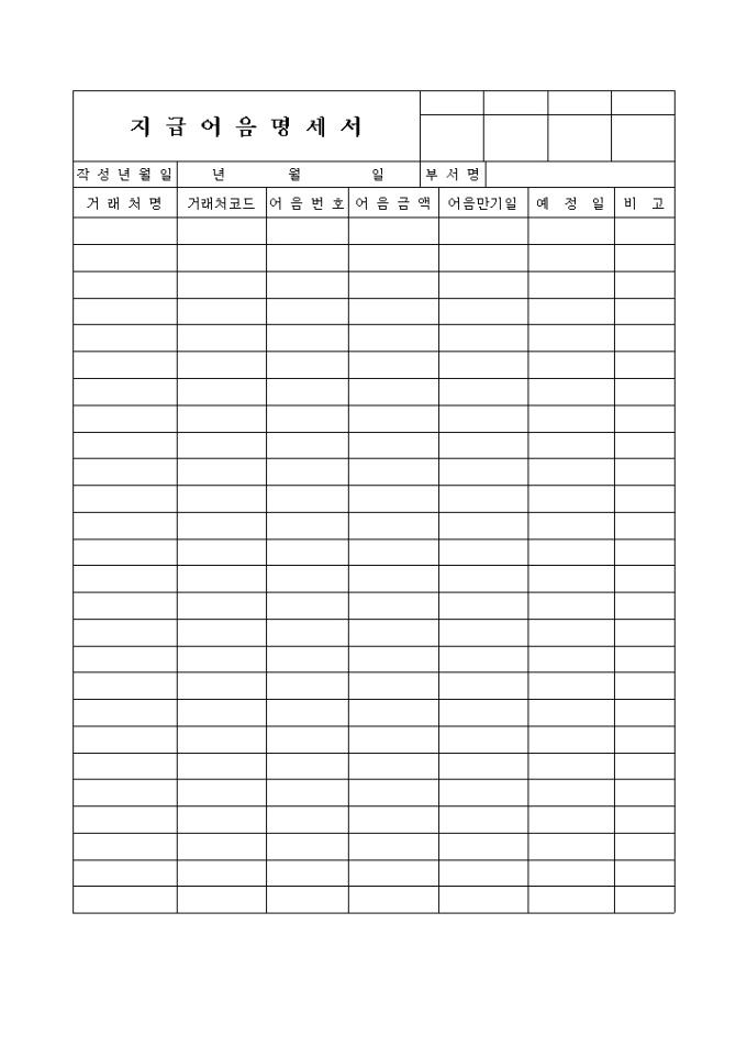 9,000원/월지급해야할 어음의 내역을(거래처 코드.어음번호, 어음금액, 만기일, 예정일)을 기입하는 양식입니다.
