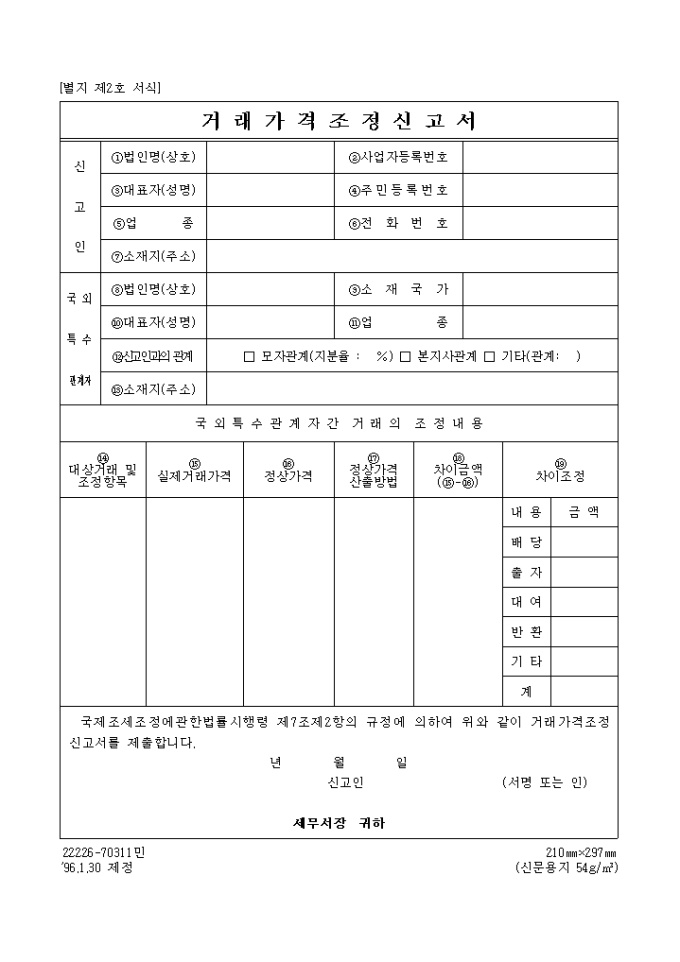 국제조세조정에관한법률시행령 제7조제2항의 규정에 의하여 위와 같이 거래가격조정신고서를 제출합니다.