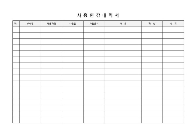 9,000원/월인감사용내역서 입니다. 부서명, 사용자명, 사용일, 사용문서 등으로 구성되었습니다. 사용 사유 및 사용자 파악에 용이한 양식입니다.
