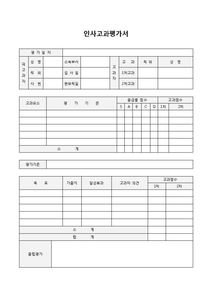 9,000원/월인사고과평가서입니다. 평가일자, 피고과자, 고과요소, 평가기준 등의 항목으로 구성되어 있습니다. 인사고과를 상세히 평가할 경우 사용 가능한 양식입니다.