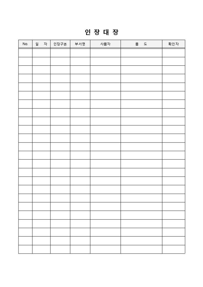 9,000원/월인장대장 입니다. 일자, 인장구분, 부서명, 사용자, 용도 등으로 구성되었습니다. 인장별 사용자 및 용도 파악에 용이합니다. 인장사용 승인자 확인에 효과적입니다.