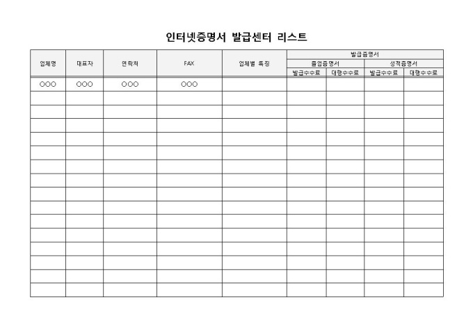인터넷증명서발급센터 리스트 입니다. 업체명, 대표자, 연락처, FAX, 업체별 특징 등으로 구성되었습니다. 각 업체별 특징 기재 및 금액 비교에 용이합니다.