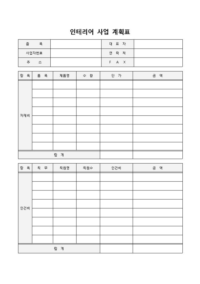 인테리어사업계획표 입니다. 자재비, 인건비, 품목, 제품명, 수량, 단가, 금액, 대표자, 연락처, Fax 등으로 구성되었습니다. 사업 관련 자재비 및 인건비 계산에 용이합니다.
