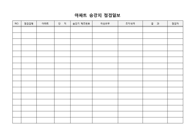 9,000원/월아파트 승강기 점검일보 입니다. 점검업체, 단지, 승강기 제조번호, 이상유무 등으로 구성되었습니다. 이상유무를 기재하고 그에 따른 조치내역 및 결과작성에 용이합니다.