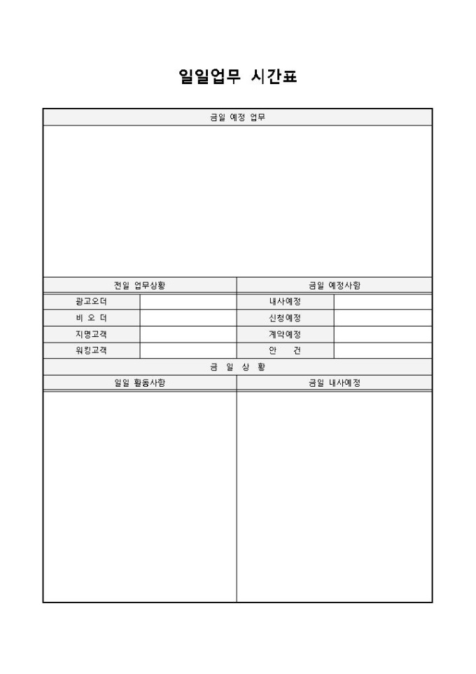 일얼업무 시간표입니다. 금일 예정 업무, 전일 업무사항, 금일 예정사항, 금일 상황, 일일 활동사항, 금일 내사예정 등으로 구성되어 있습니다. 기업의 부서에서 일일업무에 대한 시간표로 작성하여 사용할 수 있습니다.