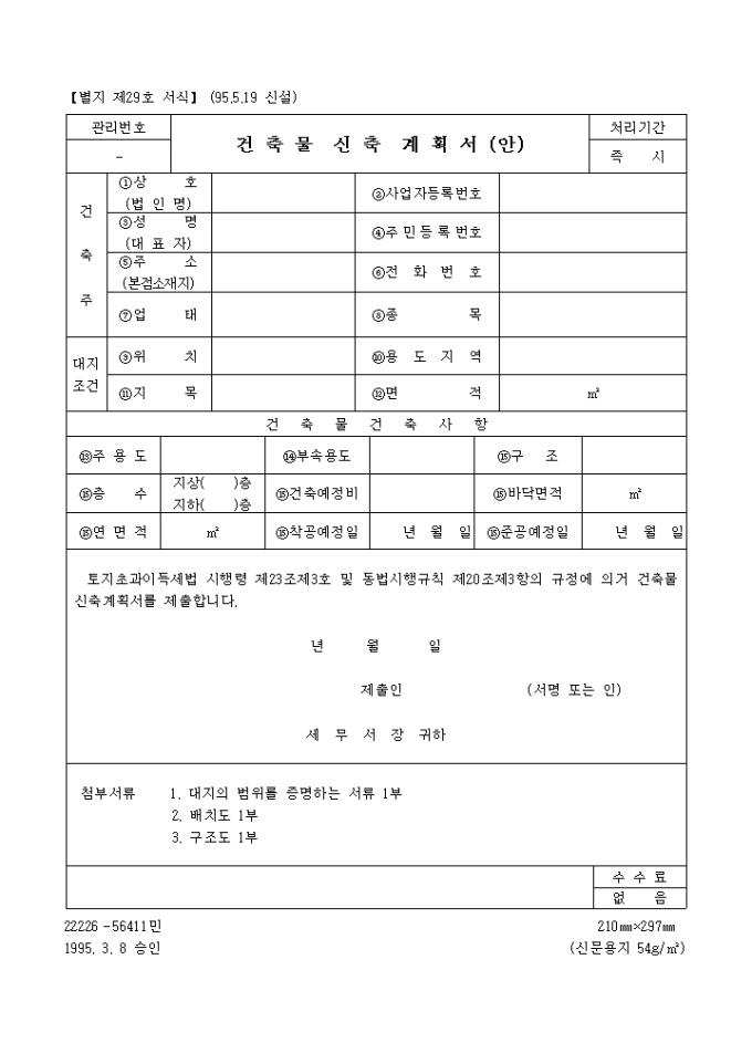 토지초과이득세법 시행령 제23조제3호 및 동법시행규칙 제20조제3항의 규정에 의거 건축물신축계획서를 제출합니다.