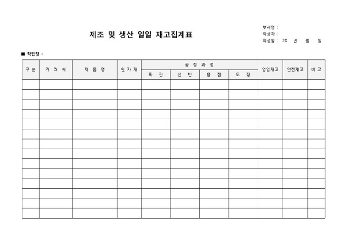 9,000원/월일일집계표(제조및생산재고)입니다. 거래처, 제품명, 원자재, 공정과정 등의 항목으로 구성되어 있습니다. 제조, 생산 후 일일 재고를 집계하여 정리할 경우 사용 가능한 양식입니다.