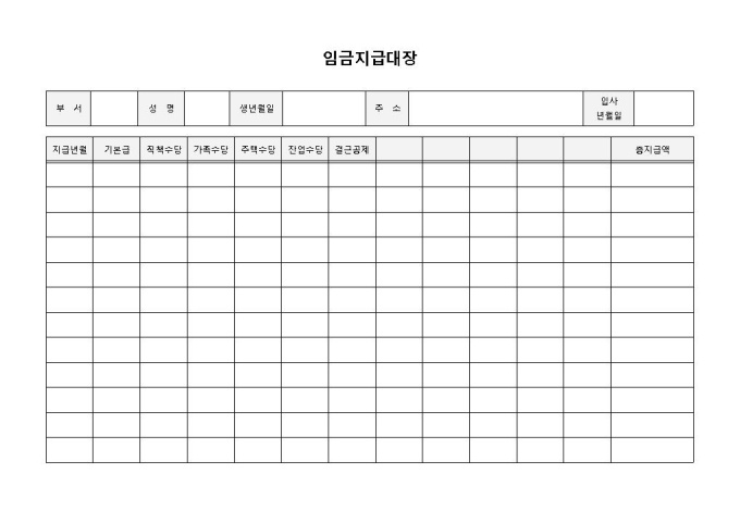 임금지급대장입니다. 지급년월, 기본급, 직책수당, 가족수당, 주택수당, 잔업수당, 결근공제 등의 항목으로 구성되어 있습니다.