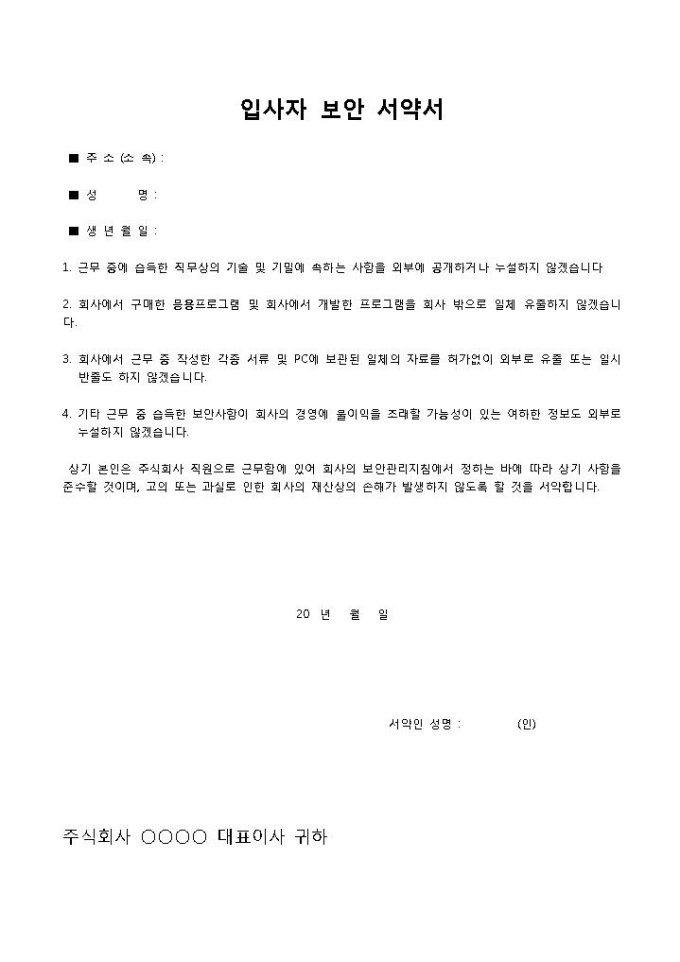 9,000원/월입사자 보안 서약서입니다. 주소, 성명, 주민등록번호, 서약 내용으로 구성되어 있습니다. 본인은 주식회사 직원으로 근무함으로 보안관리지침에서 정하는 내용을 준수하며, 고의 또는 과실로 인한 회사의 재산상의 손해가 발생하지 않도록 서약할 때 작성하여 사용할 수 있습니다.