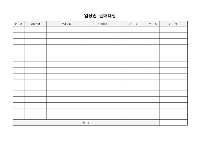 입장권 판매대장 입니다. 순번, 일자, 입장권명, 판매장소 등으로 구성되었습니다. 일일 입장권 판매 내역 및 매출 계산에 효과적입니다.