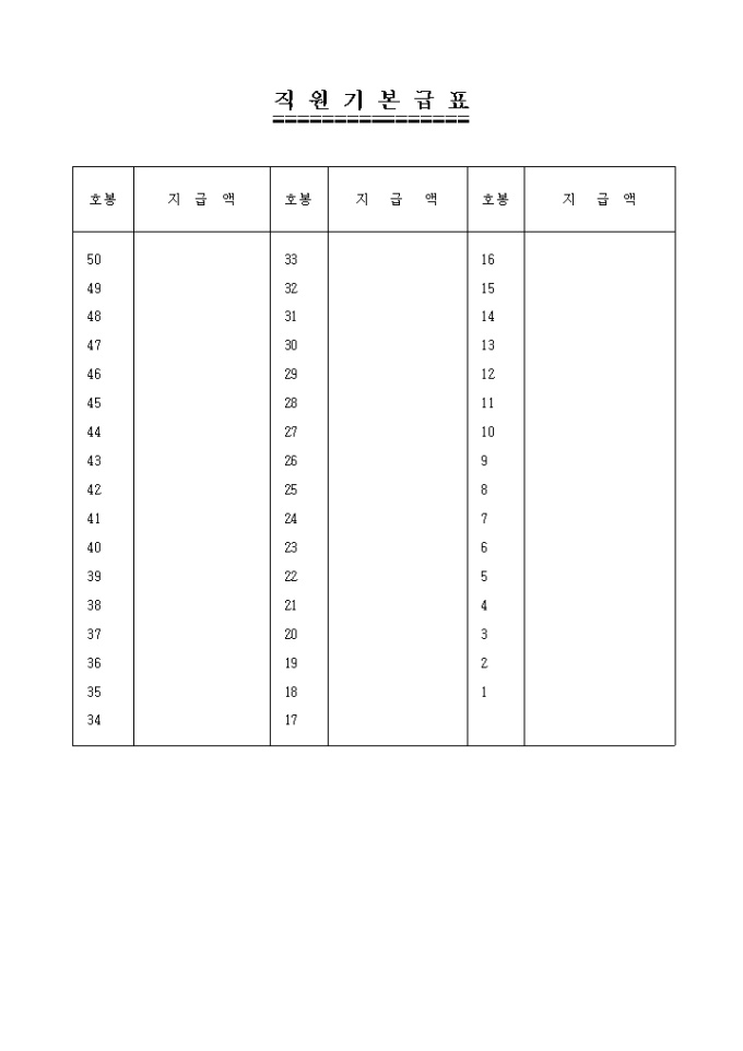 9,000원/월각 호봉별로 직원들의 기본급여를 기록하는 양식입니다.
