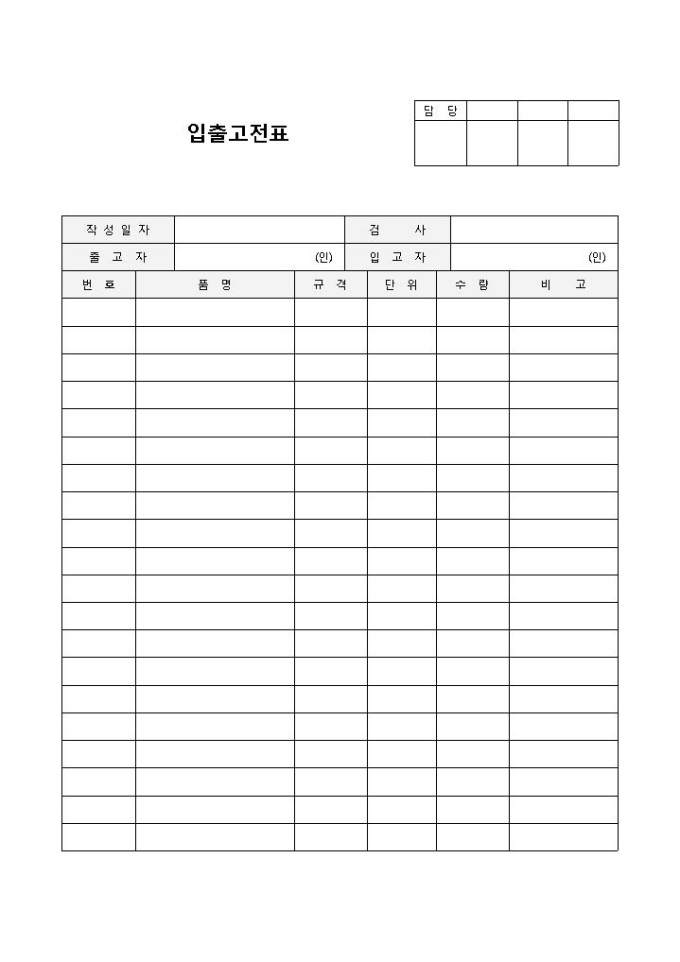 입출고전표입니다. 출고자, 입고자, 품명, 규격, 단위, 수량 등의 항목으로 구성되어 있습니다. 다수의 물건의 입고, 출고에 대해 간략하게 관리, 기록할 수 있는 양식입니다.