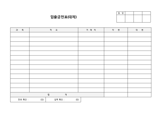 9,000원/월입출금전표(대체)입니다. 과목, 적요, 거래처, 차변, 대변 등의 항목으로 구성되어 있습니다. 기본적인 대체 입출금전표 양식입니다.