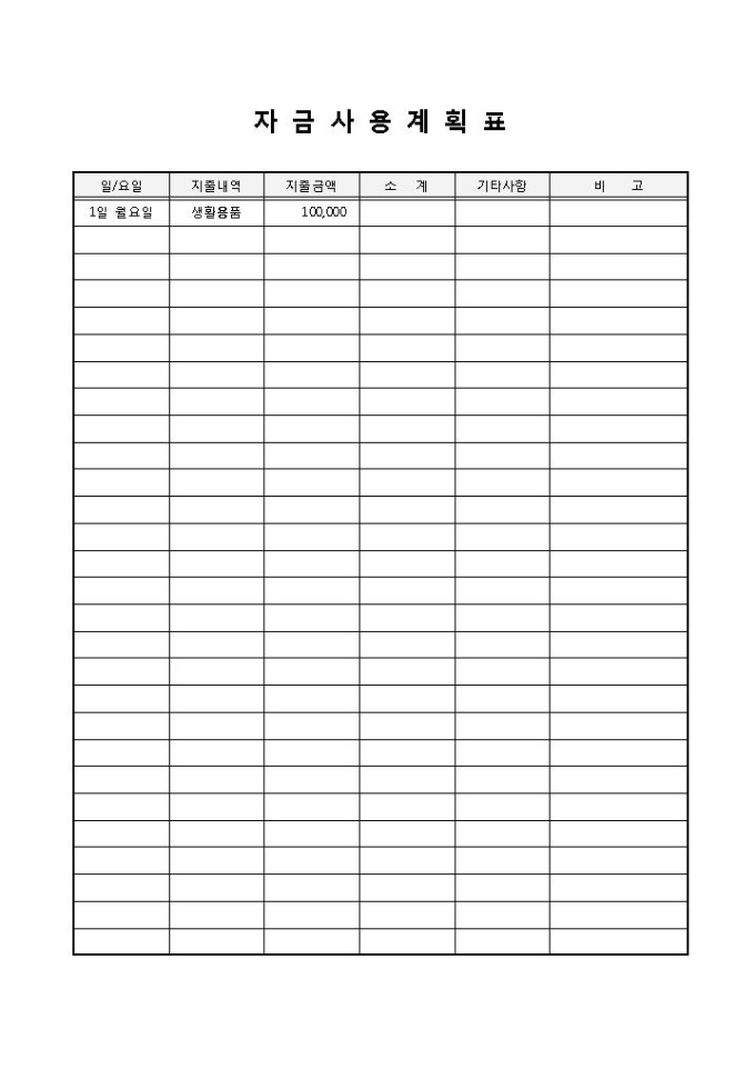 자금사용계획표입니다. 일/요일, 지출내역, 지출금액, 소계, 기타사항, 비고로 구성되어 있습니다. 기업이나 가정에서 자금에 대한 사용 계획표로 작성하여 사용할 수 있습니다.
