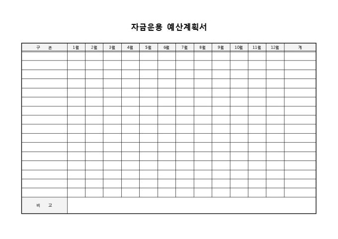 9,000원/월자금운용 예산계획서입니다. 구분, 1월, 2월, 3월, 4월, 5월 등으로 구성되어 있습니다. 기업이나 가정에서 자금에 대한 운용 예산 계획을 세울 때 작성하여 사용할 수 있습니다.
