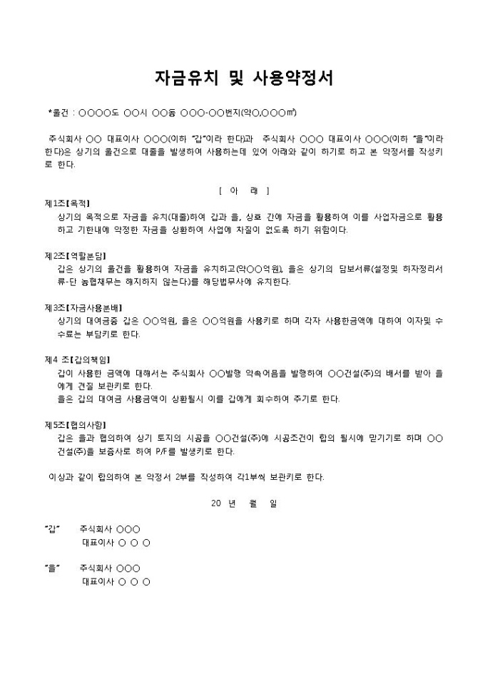 자금유치 및 사용약정서입니다. 자금유치 및 사용에 대한 약정 내용으로 구성되어 있습니다. 주식회사 대표이사와 주식회사 대표이사가 상호간에 상기의 물건으로 대출을 발생하여 사용하는데 있어 약정서를 작성할 때 작성하여 사용할 수 있습니다.