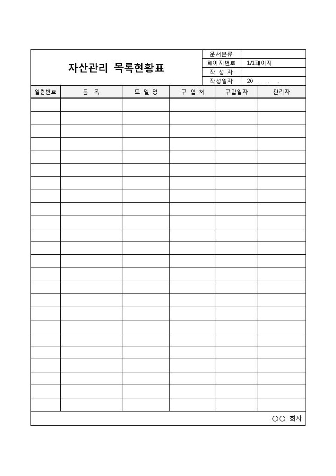 9,000원/월회사 소유 제품이나 자산 등의 관리를 위해서 현황을 목록화하여 표 형식으로 나타낸 자산관리 목록현황표 양식입니다. 일련번호, 품목, 모델명, 구입처, 구입일자, 관리자 등의 항목으로 구성되어 있습니다.