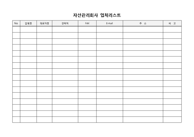 9,000원/월자산관리회사 업체리스트 입니다. 업체명, 대표자명, 연락처, FAX, E-mail, 주소 등으로 구성되었습니다. 업체별 연락처 등의 세부적인 사항을 기록하고 관리하는데 용이합니다.