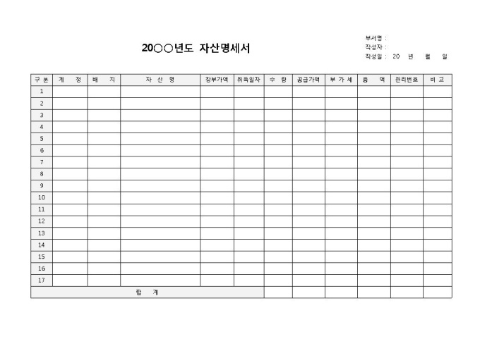 자산명세서(연도별)입니다. 계정, 배치, 자산명, 장부가액, 취득일자, 수량 등의 항목으로 구성되어 있습니다. 연도별로 자산을 관리할 경우 사용 가능하며 자산에 대한 정보를 상세히 기록할 수 있습니다.