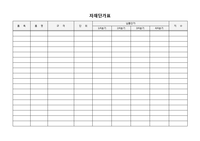 분기별 자재단가표 입니다. 품목, 품명, 규격, 단위, 분기별 납품단가 등으로 구성되었습니다. 분기별 납품단가 및 단가액 비교에 효과적입니다.