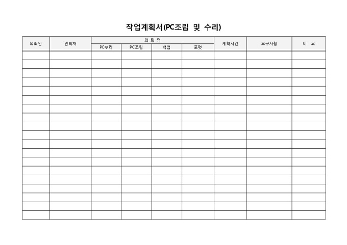 작업계획서 입니다. 의뢰인, 연락처, 의뢰명, 계획시간, 요구사항 등으로 구성되었습니다. 의뢰사항을 파악하고 업무발생시 특이사항 기록에도 효과적입니다.