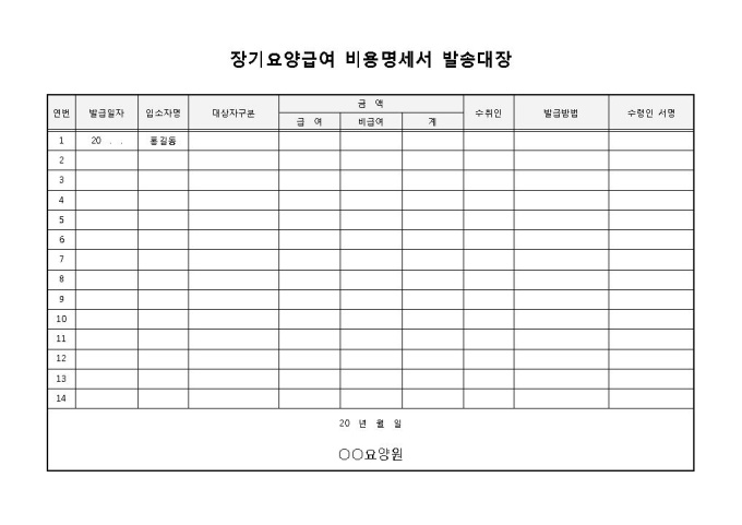 장기요양급여 비용명세서 발송대장입니다. 연번, 발급일자, 입소자명, 대상자구분, 금액, 수취인, 발급방법 등으로 구성되어 있습니다. 요양원에서 장기요양에 대한 급여를 비용명세서로 발급하고 이에 대한 발송대장으로 작성하여 사용할 수 있습니다.