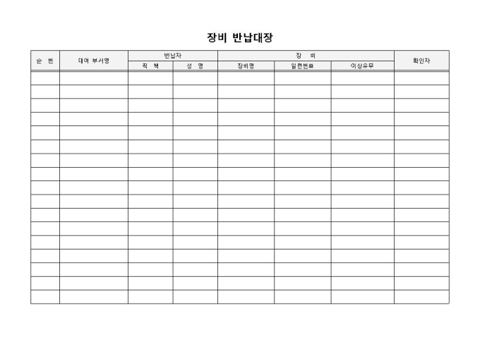 9,000원/월장비반납대장 입니다. 순번, 대여부서명, 반납자, 장비, 일련번호, 이상유무, 장비명, 성명, 직책 등으로 구성되었습니다. 반납장비의 이상유무를 확인하고 그에 따른 확인자 파악에 효과적입니다.