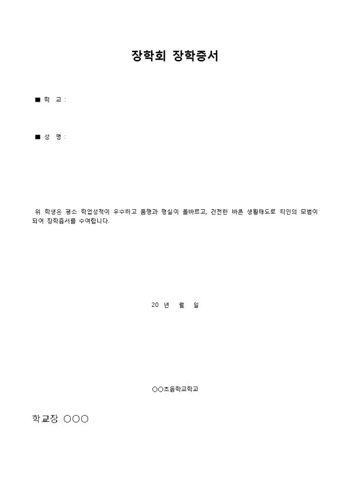 장학회 장학증서입니다. 학교, 성명, 장학 증서 내용으로 구성되어 있습니다. 학생을 평소 학업성적이 우수하고 품행과 행실이 올바르고, 건전한 바른 생활태도로 타인의 모범이 되어 장학증서를 수여할 때 작성하여 사용할 수 있습니다.