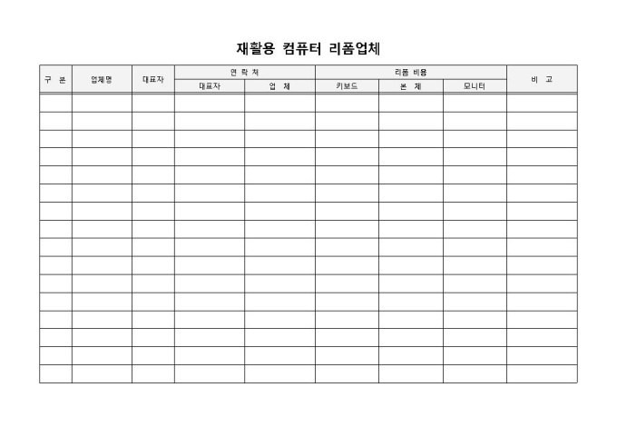 9,000원/월재활용컴퓨터 리폼업체명단 입니다. 구분, 업체명, 대표자, 연락처 등으로 구성되었습니다. 하드웨어 별 리폼 가격을 확인하고 업체별 가격비교에 용이합니다.