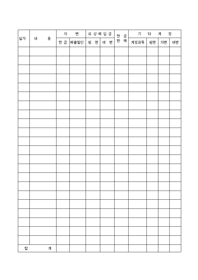 차변,외상매입금,현금판매 등을 기록하는 현금수입장 뒷면입니다.