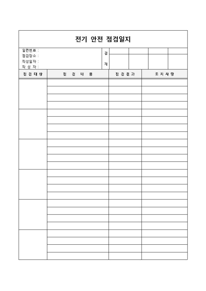9,000원/월적업장 내 전기 안전관리를 위한 점검 내용을 기록한 전기안전 점검일지 양식입니다. 점검대상, 점검내용, 점검결과, 조치사항 등의 항목으로 구성되어 있습니다.