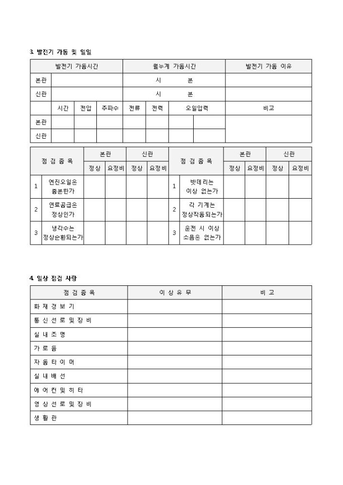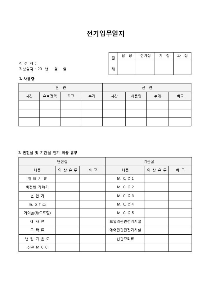 전기업무일지입니다. 사용량, 변전실 및 기관실 전기 이상 유무 등의 항목으로 구성되어 있습니다. 전기 업무에 대해 세부적으로 상세하게 기록 할 수 있고 업무사항 전반에 대해 기술할 수 있는 업무일지 양식입니다.