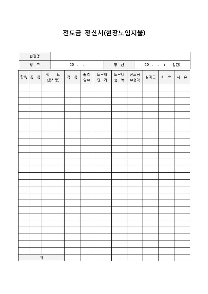 전도금정산서(현장노임지불)