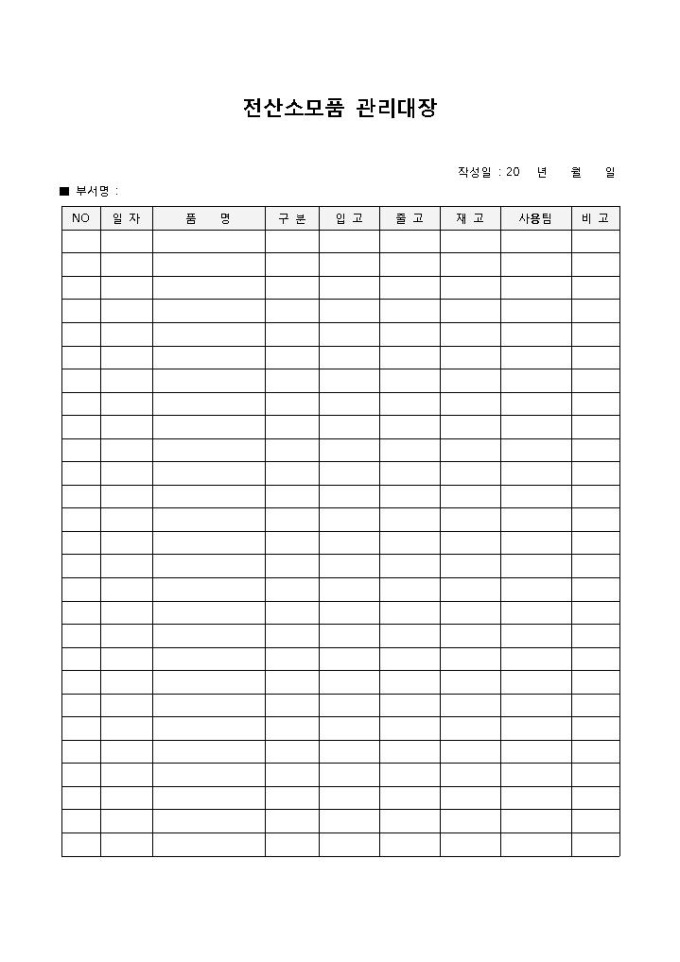 9,000원/월전산소모품(관리대장)입니다. 일자, 품명, 구분, 입고, 출고, 재고 등의 항목으로 구성되어 있습니다. 다수의 전산소모품에 대해 입출재고 현황을 간략하게 작성하여 관리 할 수 있습니다.