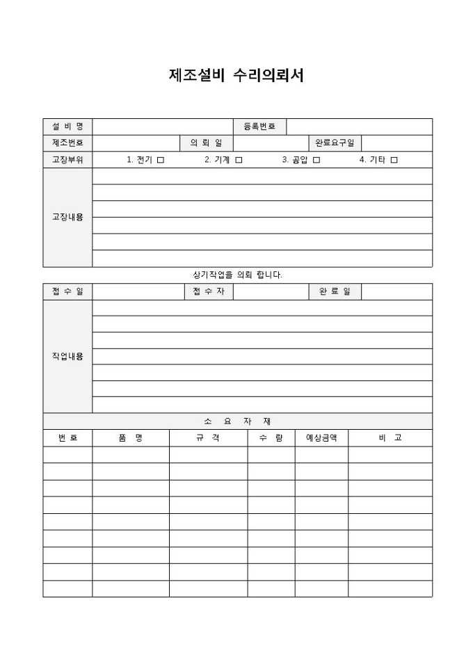 9,000원/월제조의뢰서(제조설비수리)입니다. 설비명, 제조번호, 고장부위, 고장내용, 접수일, 작업내용 등의 항목으로 구성되어 있습니다. 제조 설비의 고장내역과 수리 작업내역을 상세히 서술 할 수 있는 제조설비 수리의뢰서 양식입니다.