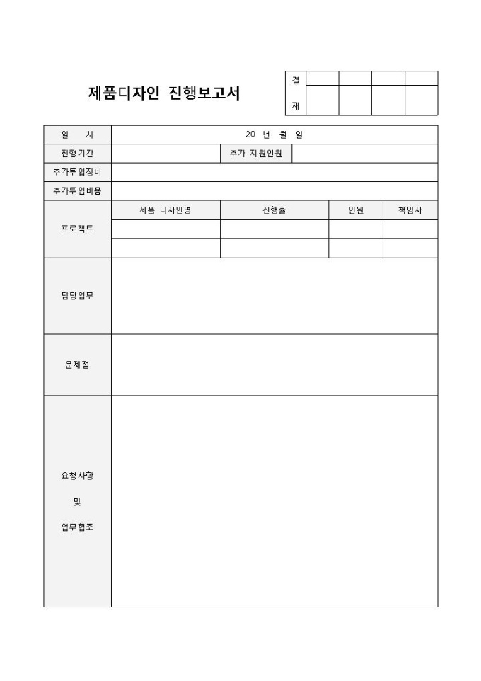9,000원/월제품디자인 진행보고서 입니다. 일시, 진행기간, 추가 지원기간, 추가투입장비, 추가 투입비용으로 구성되었습니다. 프로젝트의 진행사항을 파악하고 그에 따른 문제점 확인에 용이합니다.