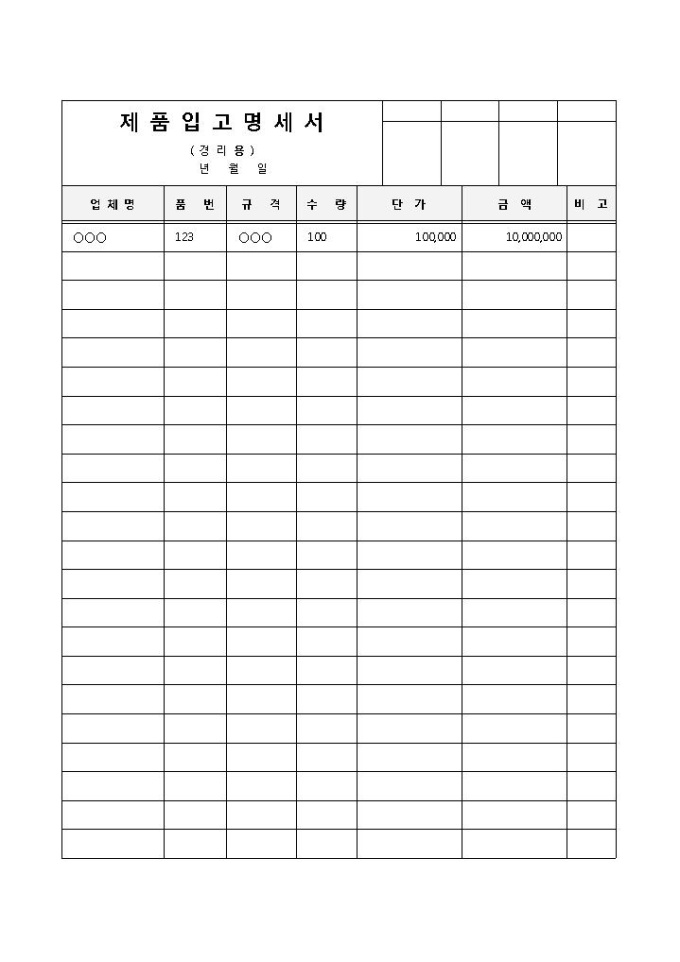 9,000원/월입고한 제품 내역 및 단가, 수량 등을 자세히 기록할 때 사용되는 제품명세서(입고) 양식입니다. 업체명, 품번, 규격, 수량, 단가, 금액 등의 항목으로 구성되어 있습니다.