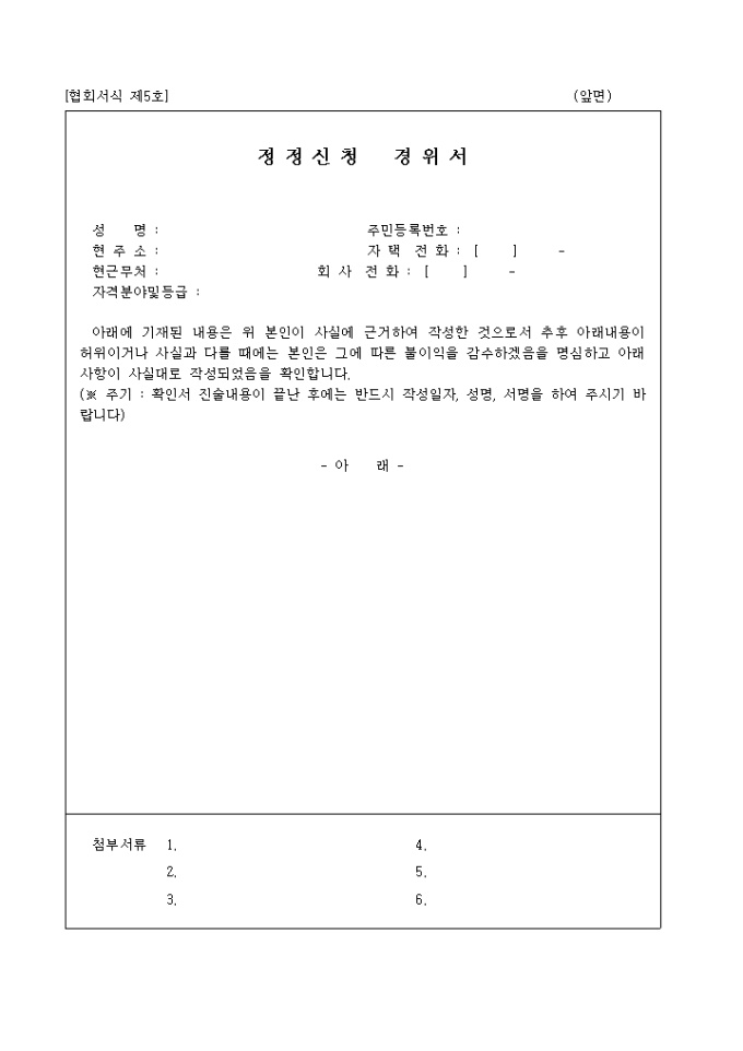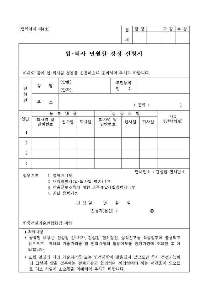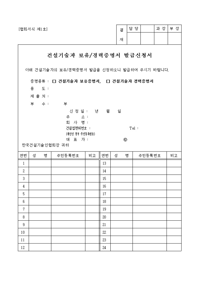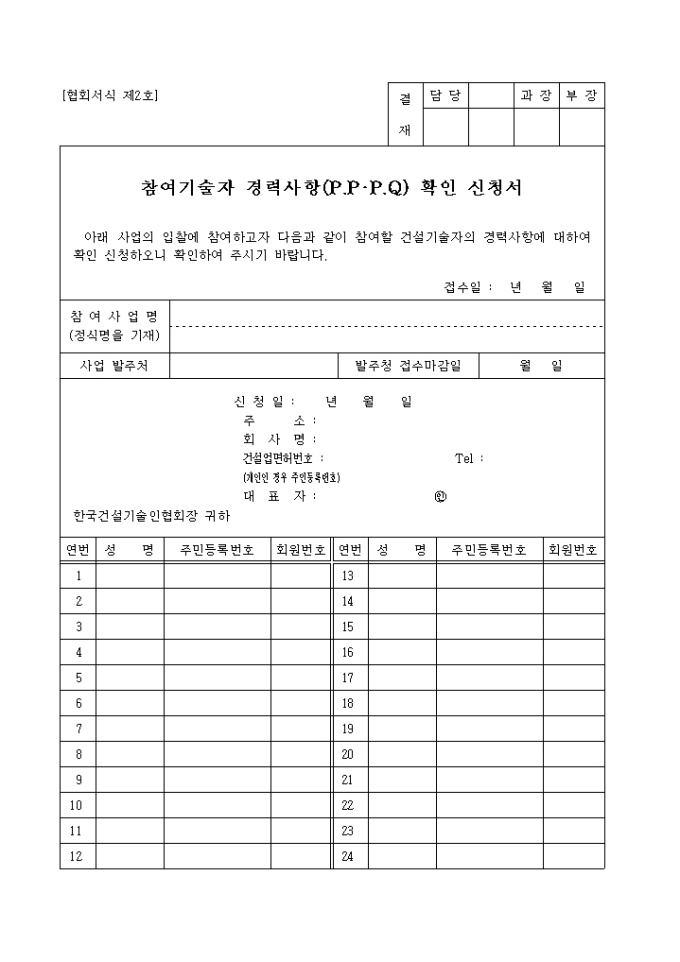 사업의 입찰에 참여하고자 참여할 건설기술자의 경력사항에 대하여 확인 신청할 때 사용하는 신청서 양식입니다.