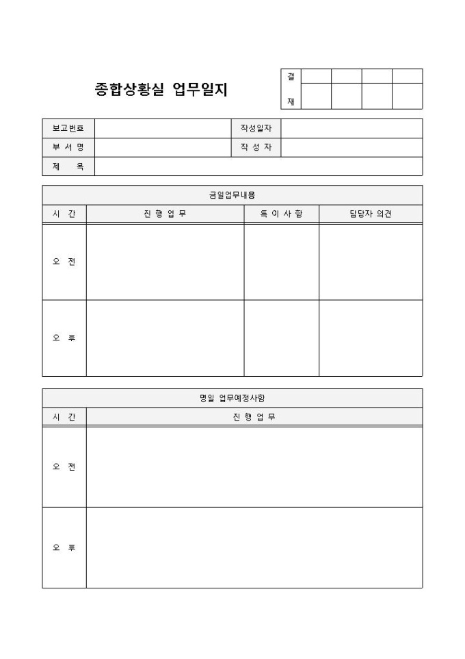 9,000원/월종합상황실 업무일지 입니다. 보고번호, 부서명, 제목, 작성일자, 작성자, 금일업무내용 등으로 구성되었습니다. 명일 업무예정사항 기록에도 용이합니다.