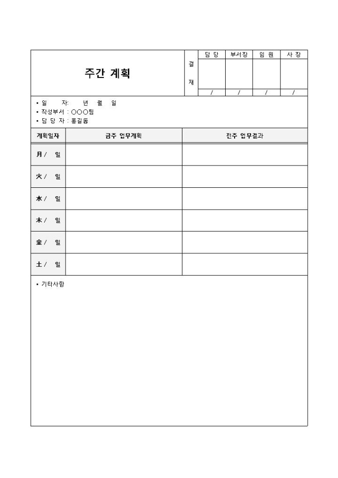 금주의 업무계획이나 전주의 업무결과를 기록하고 계획을 세울 때 사용되는 주간 계획 양식입니다. 일자, 작성부서, 담당자, 금주 업무계획, 전주 업무결과 등의 항목으로 구성되어 있습니다.