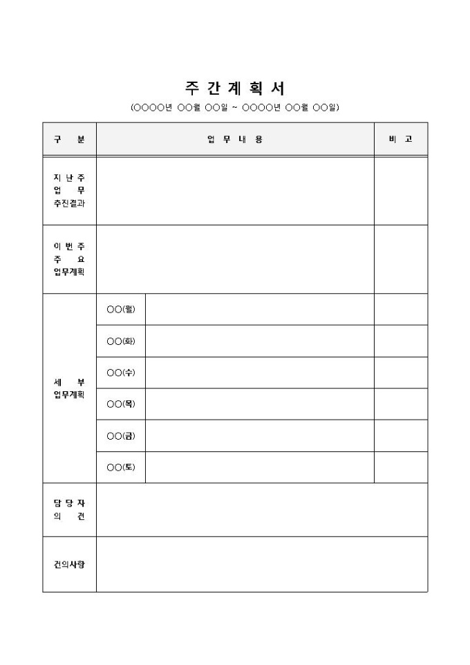 9,000원/월한 주 동안 업무의 추진 결과나 주요 계획이나 세부적인 계획을 세울 때 사용되는 주간계획서 양식입니다. 업무 추진 결과, 주요 업무 계획, 업무 내용, 담당자 의견, 건의사항 등의 항목으로 구성되어 있습니다.