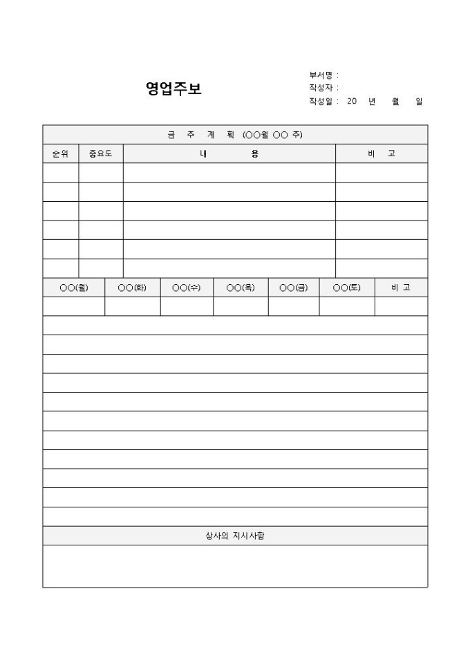 9,000원/월주보(영업)입니다. 금주계획, 순위, 중요도, 요일 등의 항목으로 구성되어 있습니다. 해당 주의 영업계획을 작성할 시 기본적으로 사용할 수 있는 양식입니다.