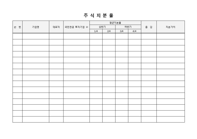 9,000원/월주식지분율 입니다. 순번, 기업명, 대표자, 국민연금 투자기업 수 등으로 구성되었습니다. 각 기업별 평균지분율 기재 및 증감사항 산출에 용이합니다.