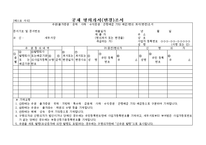 주권등의 내역, 개서또는 변경일자, 개서또는 변경사유, 구 명의자 정보, 신명의자 정보 등으로 구성된 공채 명의개서조서 양식입니다