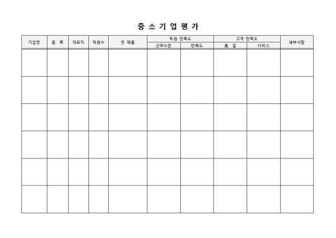 9,000원/월중소기업평가표 입니다. 기업명, 종류, 대표자, 직원수, 연매출, 직원만족도, 고객만족도 등으로 구성되었습니다. 세부사항을 통해 명시되지 않은 사항을 추가로 기입하거나, 근무 평가에 대한 총체적인 내용을 기입할 수 있습니다.