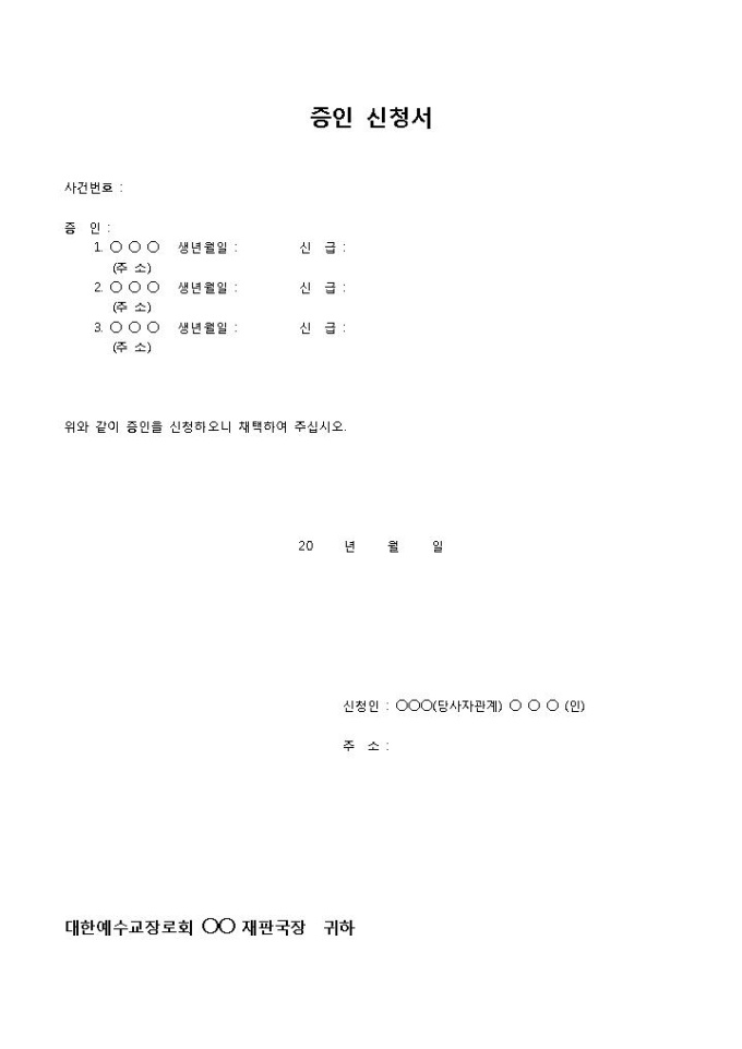 증인신청서입니다. 증인의 인적사항과 증인의 신급 등의 항목으로 구성되어 있습니다. 교회에서 사용할 수 있는 증인신청서 양식으로 최대 3인까지 증인을 기입할 수 있도록 되어 있습니다.