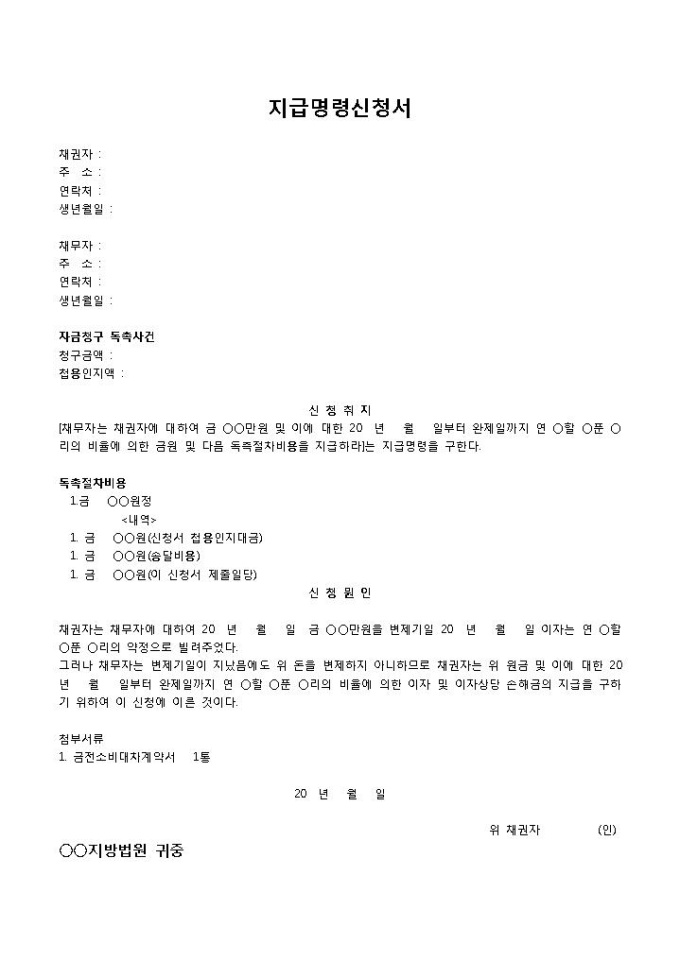 9,000원/월지급명령신청서입니다. 채권자의 인적사항, 채무자의 인적사항, 자금청구 독촉사건, 신청취지, 신청원인 등의 항목으로 구성되어 있습니다. 개인 간의 채무에 대한 지급 명령 신청시 사용 할 수 있는 양식입니다.