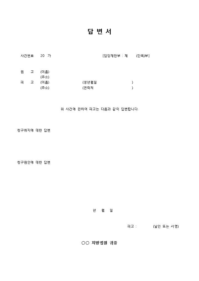 9,000원/월상대 기관의 지급 명령에 대한 본 기관의 의사를 밝혀 기록할 때 사용되는 지급명령에 대한 답변서 양식입니다. 사건번호, 원고, 피고의 이름, 주소, 청구취지, 원인에 대한 답변 등의 항목으로 구성되어 있습니다.