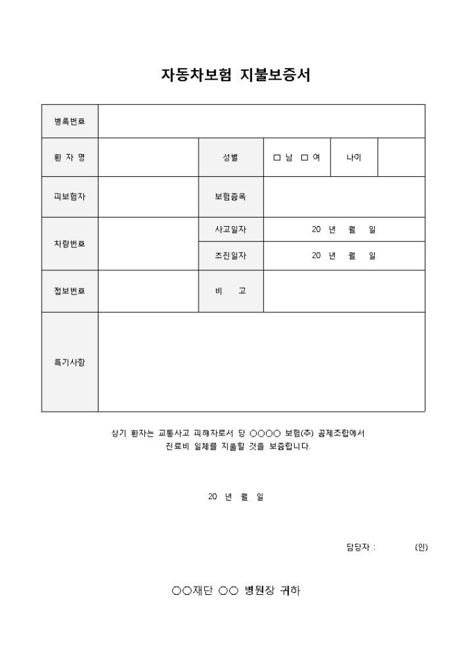 지불보증서(자동차보험)입니다. 병록번호, 환자명, 피보험자, 보험종목, 차량번호, 사고일자 등의 항목으로 구성되어 있습니다. 일반적인 자동차보험 지불보증서입니다.