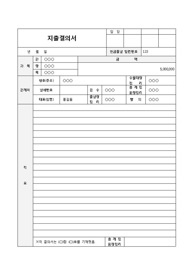 9,000원/월관계처의 상호, 검수, 출납 및 수불대장, 총 계정원장의 정리 등이 포함된 지출결의서 양식입니다. 현금출납 일련번호, 과목, 금액, 관계처, 적요 등의 항목으로 구성되어 있습니다.